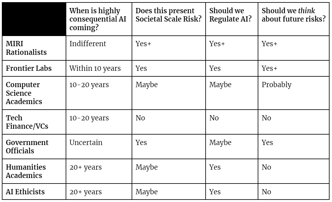 Let’s return to thinking about the AI risks. The beliefs of several subpopulations here contradict in certain regards. This is obvious in looking at the above table. Everyone can’t all be right at once. So, what is what?